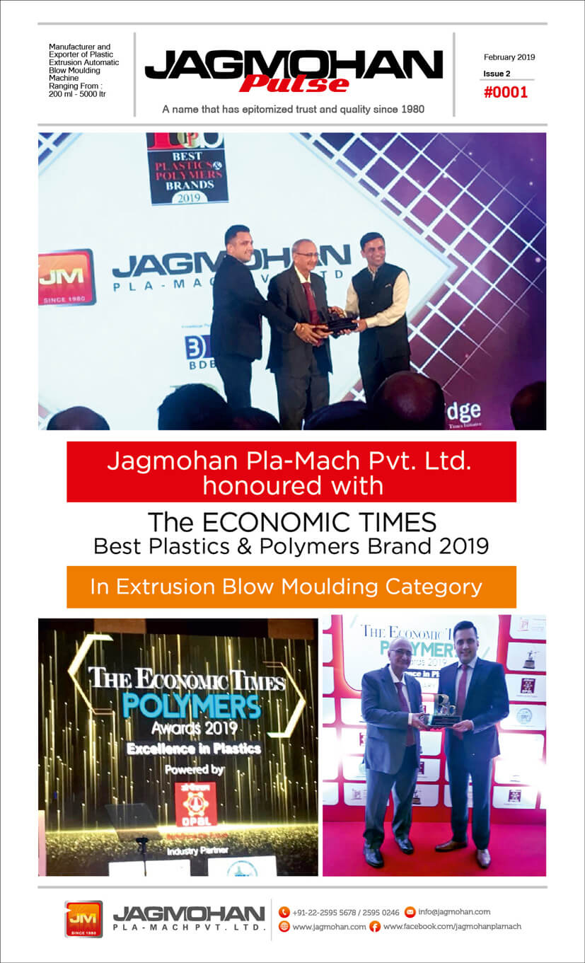 The Economics Times recognises, JAGMOHAN PLA MACH PVT LTD as THE BEST BRAND OF 2019 under the category of Extrusion Blow Molding Machines.